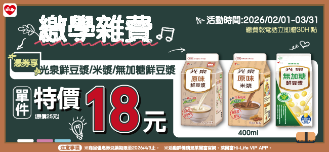 繳學雜費,憑券享光泉豆米漿 單件特價18元!
