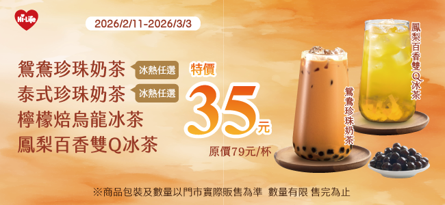 鴛鴦/泰式珍珠奶茶/ 檸檬/百香冰茶 單杯特價35元