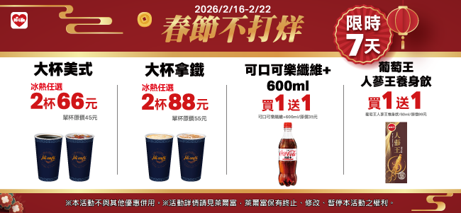 大杯美式2杯66元 大杯拿鐵2杯88元