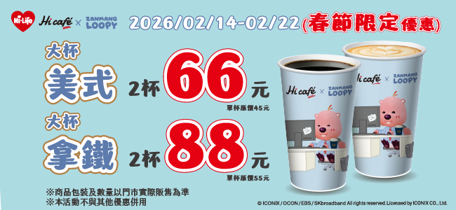 來送禮-大杯美式26杯/大杯拿鐵20杯 600元 +288元可預購LOOPY懶人毯