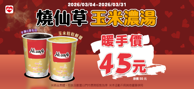 玉米濃湯、燒仙草 特價45元