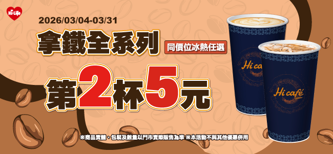 拿鐵全系列 同價位第2杯5元