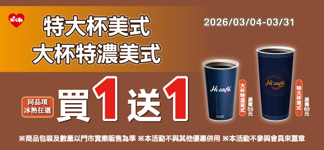 大杯特濃美式/特大杯美式 同品項買1送1