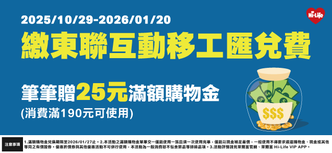 繳東聯互動(移工匯兌費),筆筆贈滿額購物金!
