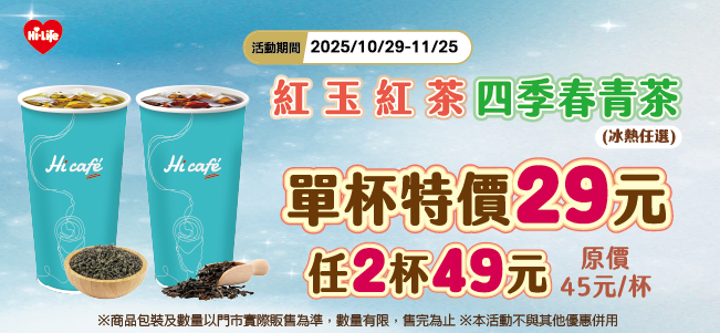 四季春青茶、紅玉紅茶特價29元 任2杯49元(冰熱)