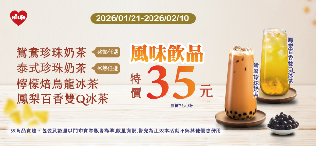 鴛鴦/泰式珍珠奶茶、檸檬/百香特價35元