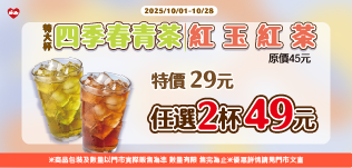 (特大杯)四季春青茶、紅玉紅茶 特價29元,任2杯49元! 超值優惠快來喝~
