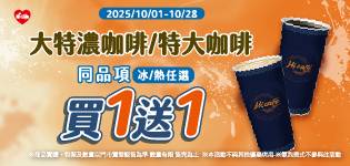 2025/10/01-2025/10/28 大杯特濃咖啡/特大杯咖啡(冰熱任選) 同品項買一送一啦!快來搶好康~