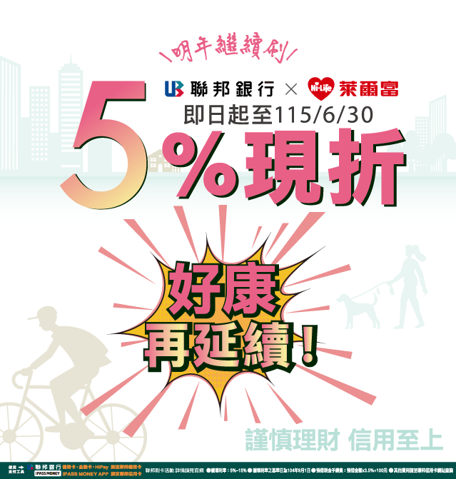活動辦法:持聯邦信用卡/金融卡/HiPay綁定聯邦信用卡/iPASS MONEY APP綁定聯邦信用卡至萊爾富消費天天享不限金額 5%現折。