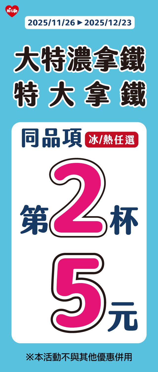 大特濃拿鐵 / 特大拿鐵 同品項 第2杯5元