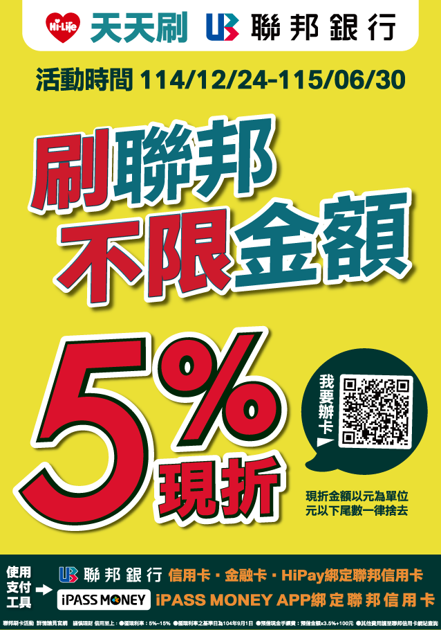 活動辦法:持聯邦信用卡/金融卡/HiPay綁定聯邦信用卡/iPASS MONEY APP綁定聯邦信用卡至萊爾富消費天天享不限金額5%現折。