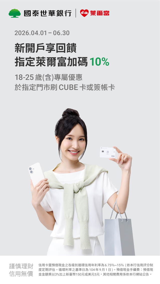 ● 首次成功開立國泰臺幣活期存款帳戶,係指於2026年6月30日前未曾持有國泰任一臺幣活期存款帳戶(含實體及數位存款帳戶),且於2026年4月1日至2026年6月30日期間首次申辦臺幣活期存款帳戶,並經國泰審核完成者。本活動開始前已持有國泰臺幣活期存款帳戶(含實體及數位存款帳戶),其後銷戶並於活動期間內重新申辦者,或已完成開戶申辦而尚未經國泰完成審核者,均不符合本活動資格。